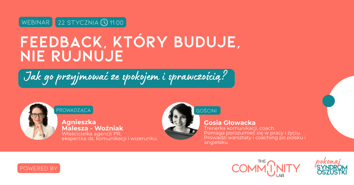 Z ogromną radością zapraszamy na pierwszy w tym roku webinar z cyklu Pokonaj Syndrom Oszustki! W 2025 roku z sukcesem zorganizowałyśmy dwa spotkania, które zgromadziły kilkaset uczestniczek i pokazały nam, jak duża jest potrzeba rozmowy o pewności siebie, komunikacji i blokadach realnie wpływających na rozwój kariery. W nowym, 2026 roku wracamy z kolejnymi tematami – aby jeszcze mocniej Was wspierać i budować społeczność silnych, pewnych siebie kobiet. Dołączcie do nas już 22 stycznia!