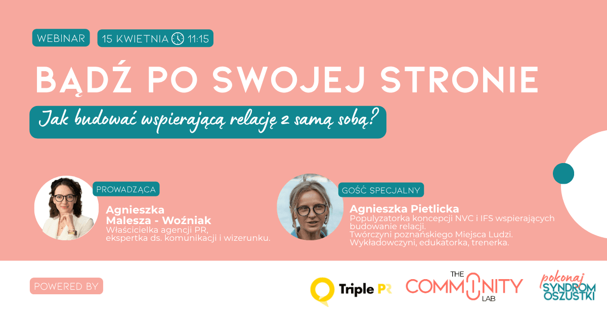 Podczas kolejnego spotkania z cyklu Pokonaj Syndrom Oszustki zapraszamy Was na drugie śniadanie z Agnieszką Pietlicką, która zaproponuje nam coś odważnego: spróbujmy – choćby na wiosnę – zaprzyjaźnić się ze sobą. Zamiast siebie poprawiać, zwalczać coś w sobie czy nieustannie się „naprawiać” i krytykować.